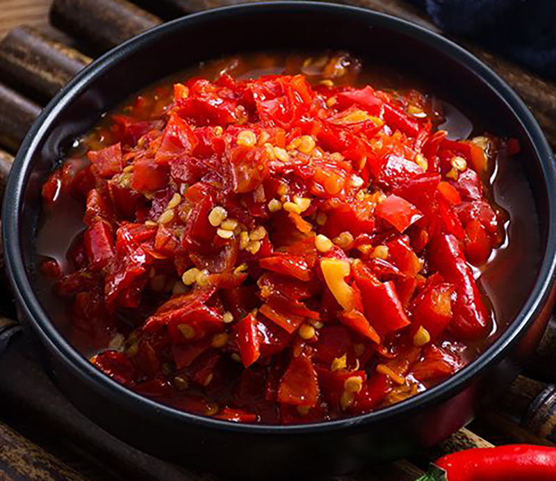 红剁椒是一种湖南特色食材,也是湖南菜中常用的调味料。它由红辣椒经过切碎、剁细而成,呈现出鲜艳的红色。红剁椒具有辣味浓郁、香气四溢的特点,为菜肴增添了独特的火辣风味。它通常用于炒菜、拌凉菜和腌制等多种菜式中,使菜品更加美味。在湖南及其他地区,红剁椒被广泛使用,并成为独特的湘菜风味的重要组成部分。